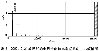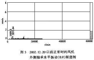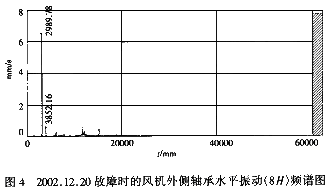 2.對(duì)照故障前后風(fēng)機(jī)外側(cè)軸承水平振動(dòng)頻譜圖3和圖4,可以看出圖中有兩個(gè)較大的峰值,其特征頻率分別為3853r/min和2989r/min。前者為風(fēng)機(jī)轉(zhuǎn)速,后者為電機(jī)轉(zhuǎn)速。正常時(shí)(圖3),風(fēng)機(jī)的振動(dòng)水平大于電機(jī)。而故障時(shí)(圖4),電機(jī)振動(dòng)水平不但遠(yuǎn)遠(yuǎn)大于正常時(shí)的水平,而且也遠(yuǎn)遠(yuǎn)大于風(fēng)機(jī)水平。因此初步判斷振動(dòng)原因在電動(dòng)機(jī)及低速齒輪軸部分。