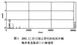 3.再對(duì)照故障前后其他測(cè)點(diǎn)的頻譜特征,發(fā)現(xiàn)都存在這樣一個(gè)現(xiàn)象,即都像風(fēng)機(jī)外側(cè)軸承水平振動(dòng)那樣有一個(gè)電機(jī)轉(zhuǎn)速一倍頻的突增,進(jìn)一步說明振動(dòng)原因在電動(dòng)機(jī)及低速齒輪軸部分(限于篇幅,僅選示電機(jī)外側(cè)軸承垂直振動(dòng)1V故障前后頻譜圖5、圖6)。