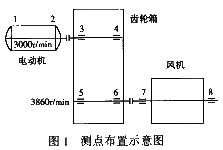 2002年12月20日,香海熱電廠1#爐高壓風(fēng)機(jī)(美國(guó)產(chǎn)海本多級(jí)離心機(jī)),在日常檢測(cè)中發(fā)現(xiàn),測(cè)點(diǎn)8(圖1)軸承水平振動(dòng)比平時(shí)大出五倍,最大振動(dòng)有效值7.6mm/s(圖2),已嚴(yán)重超過標(biāo)準(zhǔn)。
