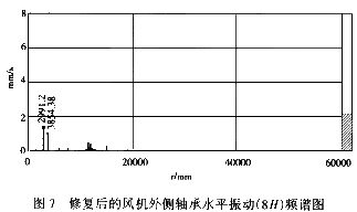 根據(jù)上述分析,及時(shí)停機(jī)檢查,結(jié)果發(fā)現(xiàn):電機(jī)風(fēng)扇的6個(gè)扇葉掉了1個(gè),造成了不平衡。風(fēng)扇修復(fù)后測(cè)得振動(dòng)頻譜圖如圖7,振動(dòng)有效值見表2。各點(diǎn)振動(dòng)均恢復(fù)正常。如故障時(shí)最大的風(fēng)機(jī)外側(cè)軸承水平振動(dòng)8H由7.6mm/s降為2.3mm/s。